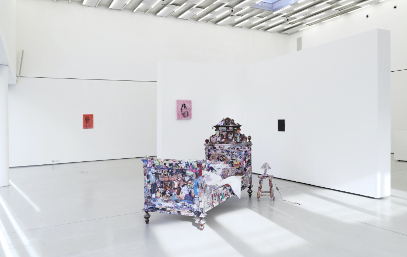Wie bei der Installation "A Room Full Of Yous I", 2025 überdeckt Amanda Burzić Möbelstücke aus Ihrem Kinderzimmer vollständig mit einer dichten Mosaikhaut aus Stickern, Perlen, Kunststoff-Strasssteinen, Papiercollagen aus Magazinseiten, Plastikfiguren, … Mit einer letzten Schicht Epoxidharz wird sie versiegelt. Auch andere Objekte wie Handyhüllen, eine Lampe, eine Gitarre, ein Hocker und Zeichnungen werden so behandelt. Mit dieser Installation zeigt und hinterfragt Amanda Burzic die symbolische Funktion des „Zimmer-Universums“ – jenes Rückzugsorts fern der Welt, der identitäre Transformationen ermöglicht, wie sie etwa in der Jugend stattfinden. Das Zimmer oder das Bett werden zur Projektionsfläche für mentale und existentielle Vorstellungen. Es ist ein in sich geschlossenes, autarkes Universum, in dem alles existieren kann: der Körper, das Begehren, die Erinnerung und die Vorstellungskraft. Das Bett ist auch unser unbewegliches Raumschiff – getaucht in blaues Licht – von dem aus wir mit Hilfe unserer Bildschirme und sozialen Netzwerken die Welt erkunden. Es ist eine Welt im Kleinen, eine bewohnbare Skulptur, ein Theater des Selbst.