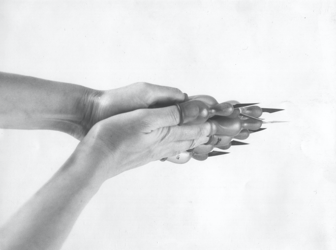 Renate Bertlmann, „Messerschnullerhände (Ambivalenzen), 1981 Schwarz-Weiss Fotografie Vintage, matt 17,7 x 24 cm, im Passepartout 30 x 40 cm Rückseite signiert Renate Bertlmann 1981 © Renate Bertlmann / Bildrecht Wien