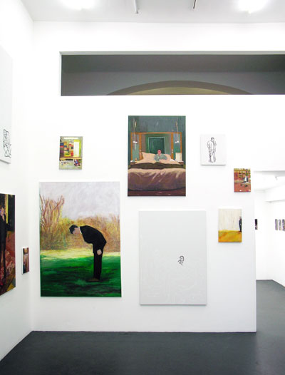 Julius Deutschbauer malt sich in dieser Ausstellung nach der Natur seiner Plakate. In einer Art transpressionistischen Malerei malt er sich allein, d.h. alle anderen weg und das ex, scheinbar kinderleicht. Mit Ölkreide auf Leinwand wird da munter subtrahiert. „Seine Plakate haben Modellcharakter“, meint Peter Pakesch einmal dazu, „wie auch Deutschbauers Malerei, die sich selbst und seine Plakate zum oder als Modell nimmt.“ Transpressionistische Subtraktionsmalerei eben.
